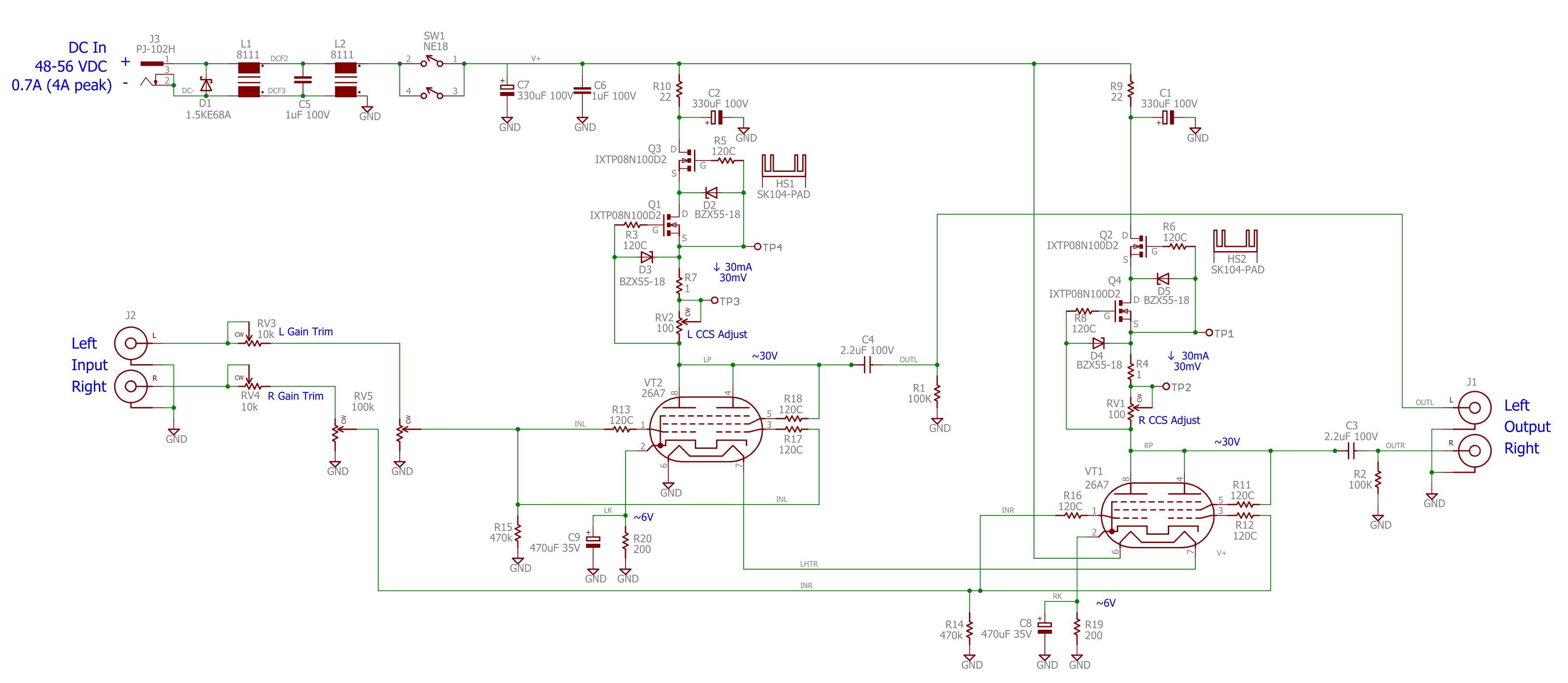 I loaded the parallel triode connected 26A7 with a CCS. The power supply is a 54V desktop switcher, so B+ here is 54V. The two 26A7 heaters are connected in series. Otherwise this is pretty conventional: