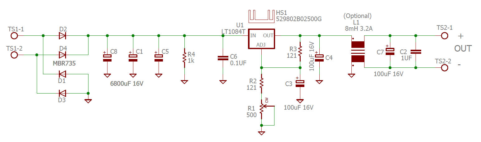 Just a simple rectifier/filter, LT1084 or LT1085 (or similar) voltage regulator IC, and a common-mode choke like the ones used on switching power supplies. The common-mode choke is optional - you can install two jumpers if you don't want it. It is intended to help reject common-mode noise that might capacitively couple across the power transformer from primary to secondary. It can also help filter rectifier recovery noise. Note that due to resistance in the common mode choke you need to adjust the voltage under load... you lose a couple tenths of a volt across the CML.
