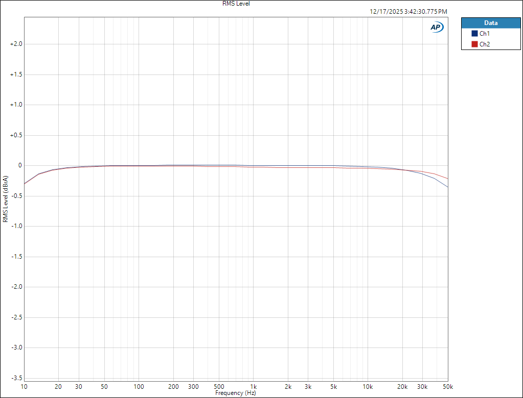 Frequency response - within 0.5dB 10Hz - 50kHz. Note that this is loaded with 100k. At lower loads you will start to see rolloff at low frequency due to the output coupling capacitors. For loads under 10k or so it would be best to increase the 2.2uF coupling caps to something bigger. If you want to drive 600 ohms best use 20uF or so.