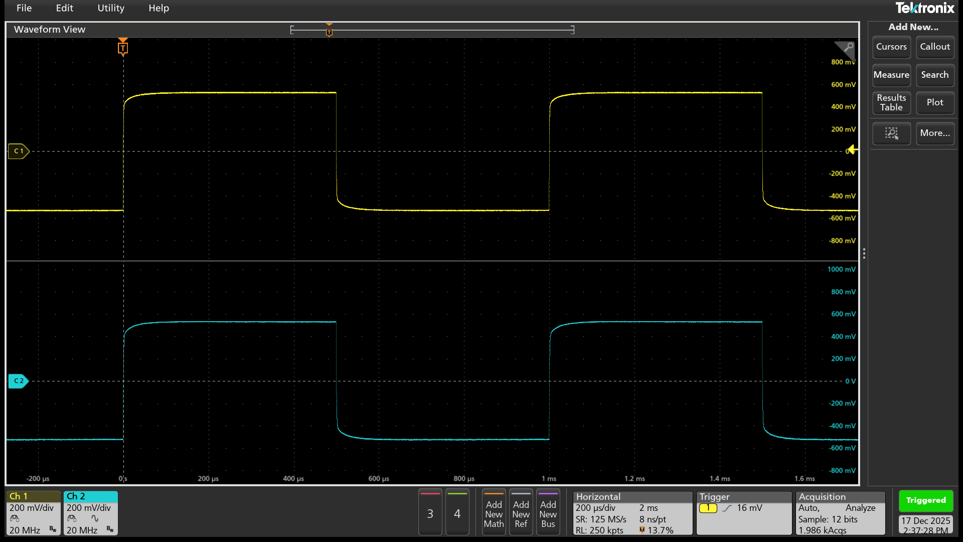 Note that I specified a fairly high power desktop switching power supply. The cold resistance of the two heaters in series is 12 ohms... that means at power up it will draw over 4A. The supply I used is OK with powering up into the cold heaters if you switch it on via the AC input - it just thinks it's charging a bunch of capacitance. But if you switch the DC side (like I did here with a power switch on the board), the supply thinks you have shorted the output so it shuts off. But it goes into a retry mode ("hiccup" mode) turning on and off. Eventually it gets the heaters hot enough that the resistance increases and it stays on. This doesn't seem to cause any issues, but you should be aware of it.