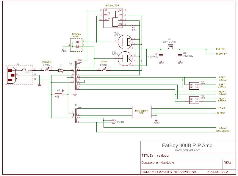 The circuit design is old school: Choke-loaded triode direct coupled to DHT driver, transformer coupled to the push-pull 300B output tubes. I used Tango NC-14 interstage and FX40-5 output transformers, which I've had around for a while. Since there is no NFB I'm sure you can use other iron that is more available now. You might need to tweak the driver circuit to optimize it for a different IT, though.
