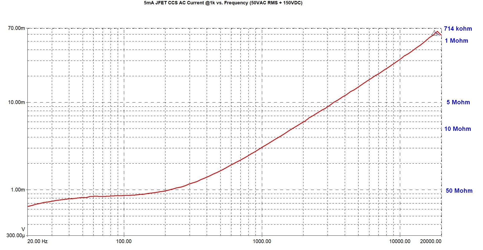 Here's what the impedance looks like for the JFET version, running at 5mA with 50V AC RMS plus 150V DC across it: