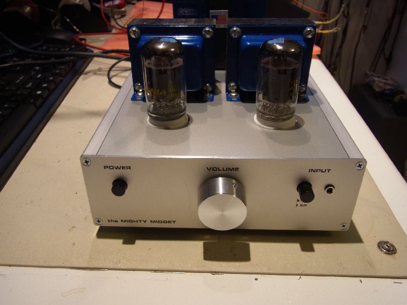 The "Mighty Midget" is a simple single-ended pentode amp that uses inexpensive compactron TV tubes. It puts out about 3 watts per channel, and uses only one (two-section) tube per channel.