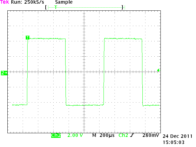Square wave response (~4V RMS, no significant change with amplitude, or even with no load - good HF stability) (this is a 500MHz scope, so nothing hiding!):