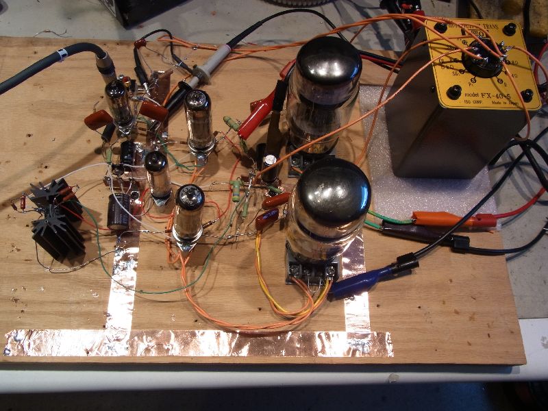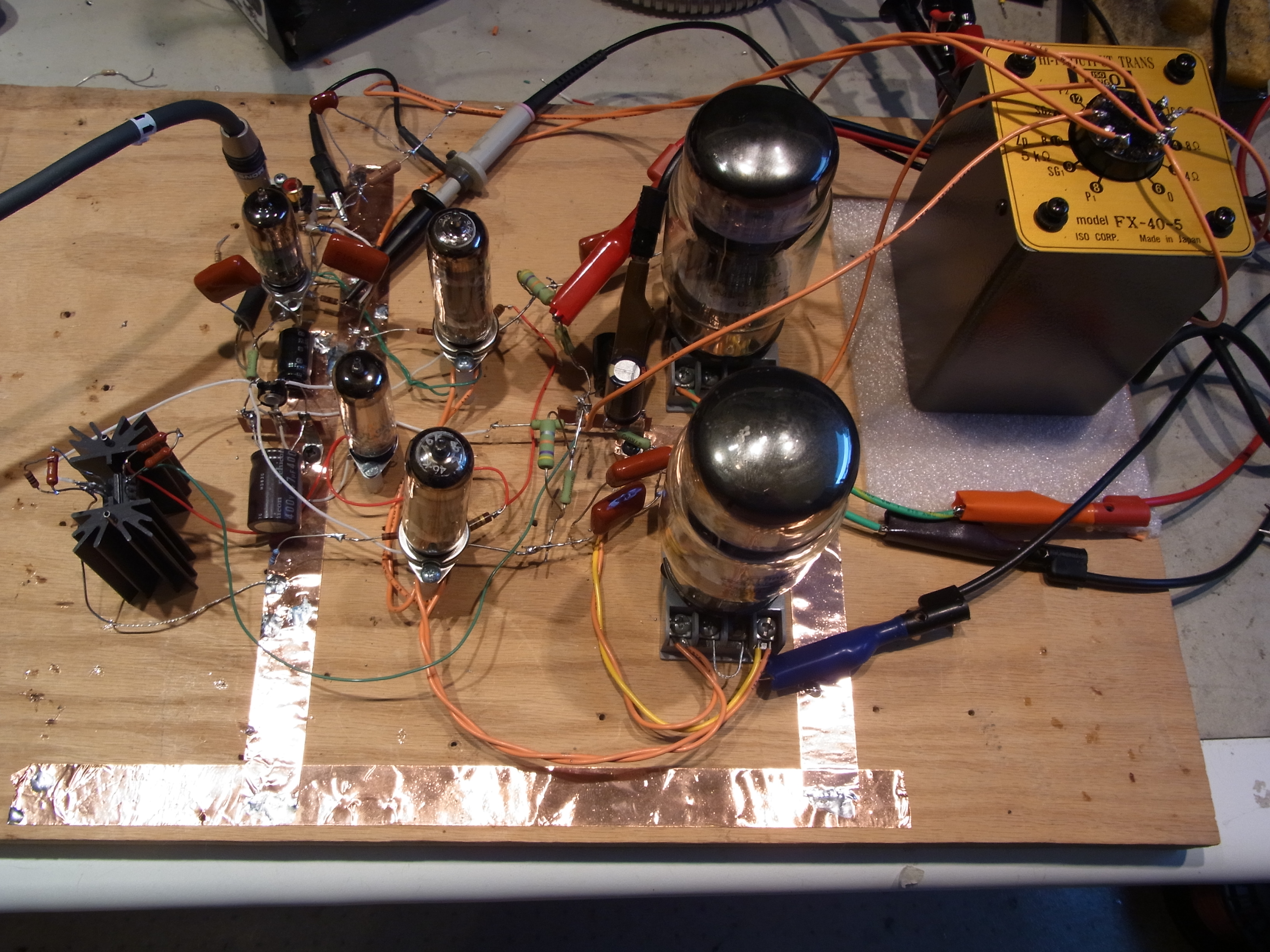 The amp on the breadboard is push-pull triode-mode KT88s, running fixed bias with a plate voltage around 400V, and Tango FX-40-5 output transformers (5k plate-to-plate).